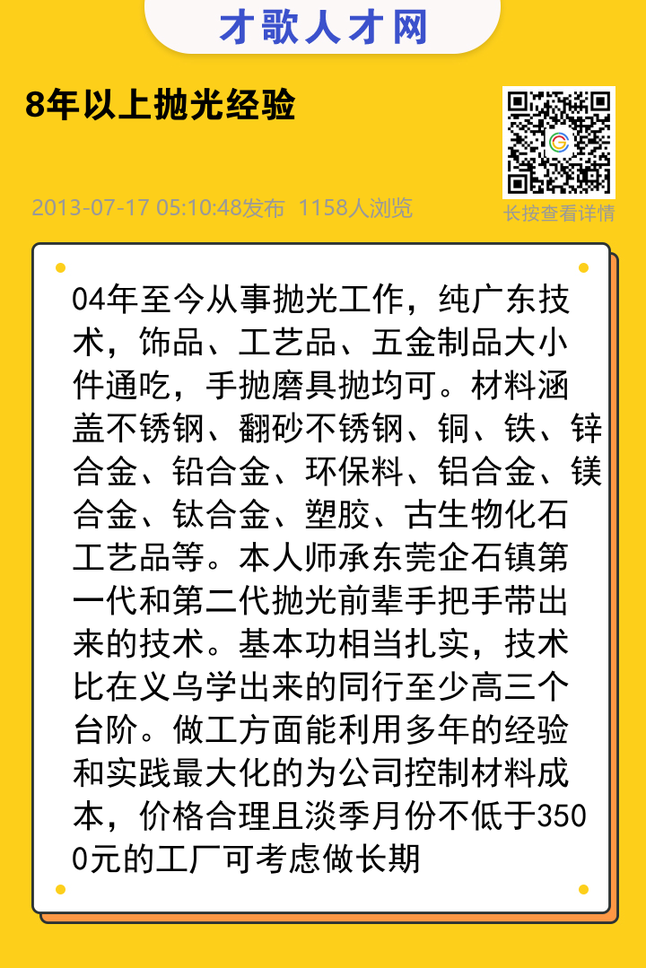 04年至今从事抛光工作,纯广东技术,饰品、工艺品、五金制品大小件通吃,手抛磨具抛均可。材料涵盖不锈钢、翻砂不锈钢、铜、铁、锌合金、铅合金、环保料、铝合金、镁合金、钛合金、塑胶、古生物化石工艺品等。本人师承东莞企石镇第一代和第二代抛光前辈手把手带出来的技术。基本功相当扎实,技术比在义乌学出来的同行至少高三个台阶。做工方面能利用多年的经验和实践最大化的为公司控制材料成本,价格合理且淡季月份不低于3500元的工厂可考虑做长期