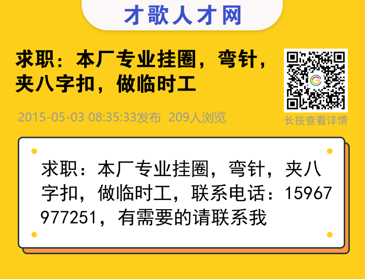 求职:本厂专业挂圈,弯针,夹八字扣,做临时工,联系电话:15967977251,有需要的请联系我
