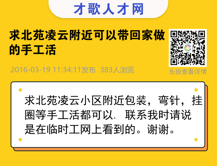 求北苑凌云小区附近包装,弯针,挂圈等手工活都可以. 联系我时请说是在临时工网上看到的。谢谢。