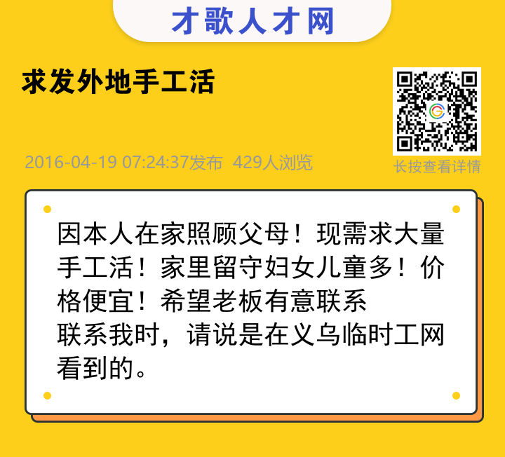 因本人在家照顾父母!现需求大量手工活!家里留守妇女儿童多!价格便宜!希望老板有意联系 联系我时,请说是在义乌临时工网看到的。